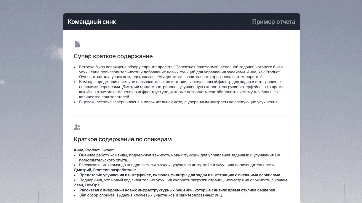 ИИ-отчёты — структурированные итоги с решениями, задачами, следующими шагами
