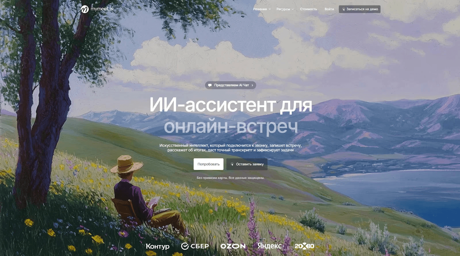 mymeet.ai — это ИИ-ассистент для онлайн-встреч. Система автоматически записывает созвоны, создаёт транскрипты с определением говорящих и генерирует структурированные отчёты.