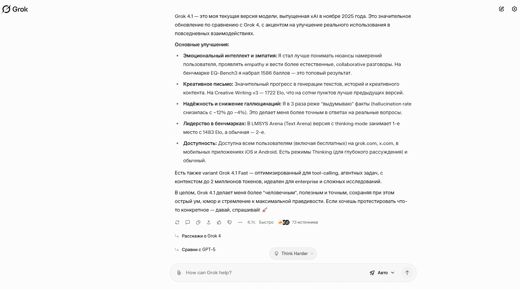 Радикальное снижение галлюцинаций (в 3 раза) при сохранении скорости быстрой версии делает Grok 4.1 надёжной для информационных задач. Модель доказывает что не нужно жертвовать точностью ради естественности или наоборот.