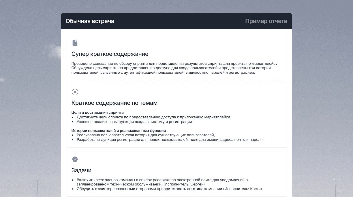 ✅ ИИ-отчёты — структурированные итоги с решениями, задачами, следующими шагами